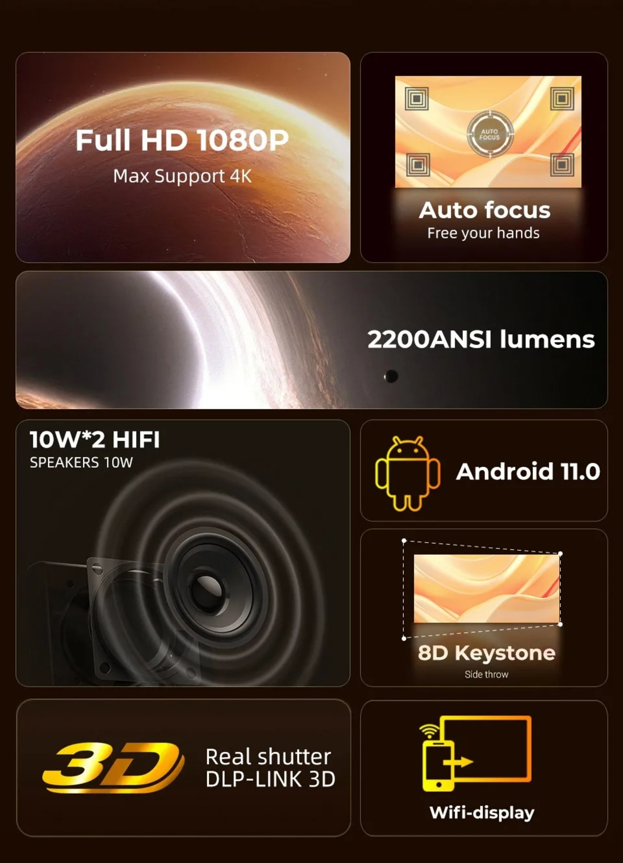 【โปรเจคเตอร์แบบ Full HD 】: โปรเจคเตอร์1080 1920 Full HD รองรับสัญญาณอินพุต4K สูงสุด2200เครื่องฉายเทคโนโลยี DLP ความสว่างสูงของ Ansi ความสว่างของหน้าจอสม่ำเสมอ