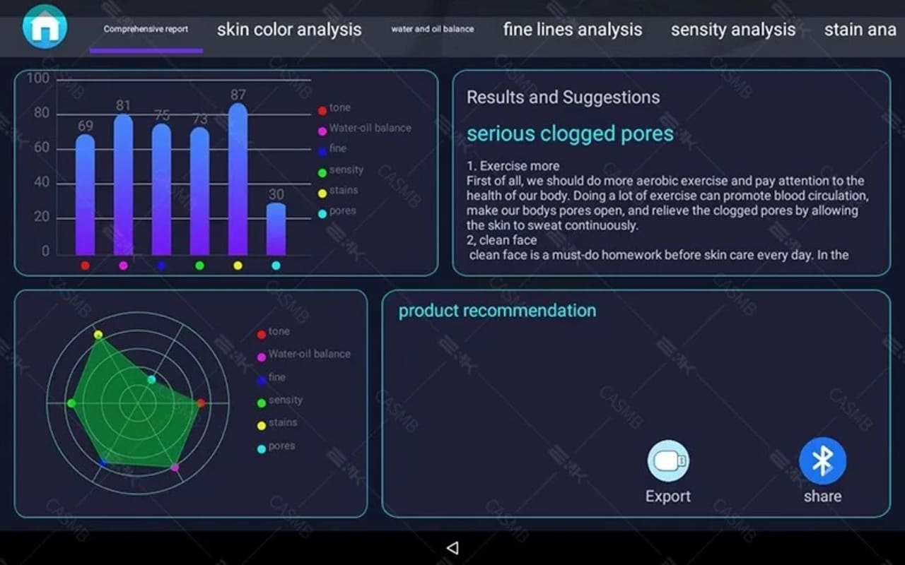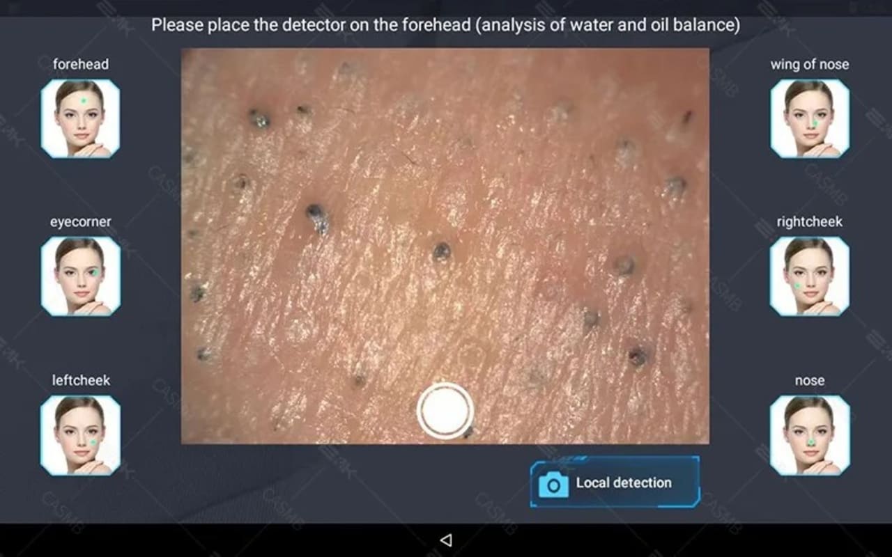 3.แปดรายการตรวจจับ: ริ้วรอย, รูขุมขน, คราบ, ความหยาบ, ปริมาณน้ำมัน, ความไว, ความชื้น, สิว
